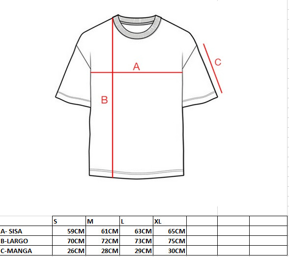 Mira nuestra tabla de medidas que esta a continuacion y comparala con la remera que te quede mas comoda! Te recomendamos que para tomar las medidas la apoyes en una mesa.